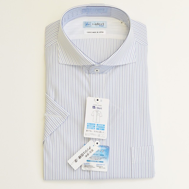 【半袖】完全ノーアイロン|ワイシャツ|i-Shirt|レギュラーシルエット|サックス|カッタウェイ|ストライプ