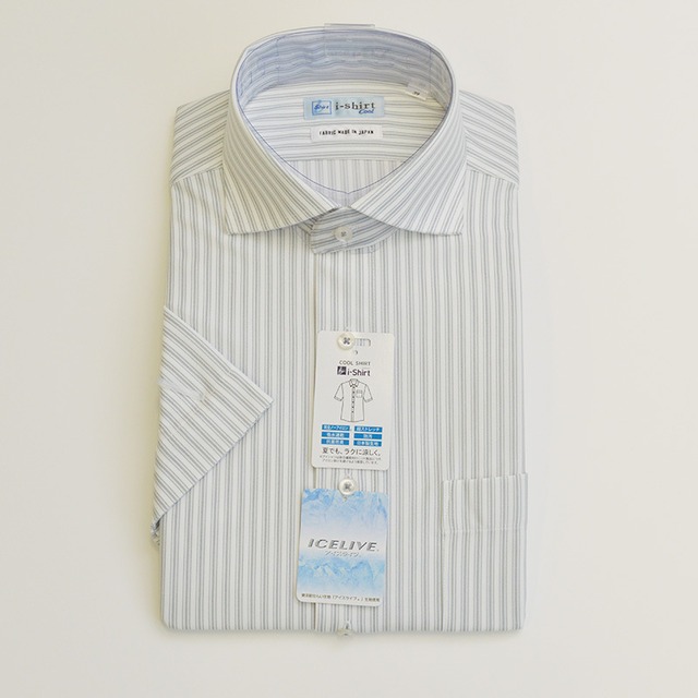 【半袖】完全ノーアイロン|ワイシャツ|i-Shirt|レギュラーシルエット|L.グレー|カッタウェイ|ストライプ