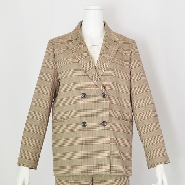 ※セットアップのパンツは別売りです。 ◆素材 ポリエステル64% レーヨン35% ポリウレタン1% 裏地:ポリエステル100% ◆機能 - ◆サイズ ※画像マネキン:【肩幅:38cm/胸囲:82cm】Mサイズ着用 ◆特徴など クラシカルなチェック柄で仕立てた テーラードダブルジャケット。 マニッシュなダブルフロントに トラッドなチェック柄を掛け合わせることで 知的で洗練された大人の印象に。 端正なシルエットの中に、ほどよいゆとりを加え 今の気分に寄り添うバランスに。 総裏地付きで仕立て映えし、きちんと感を演出しながらも さらりと羽織れる一着です。 両サイドにはポケットを備え、機能性も十分。 ベンツ入りで動きやすさも兼ね備えました。 手洗い可能なウォッシャブル対応で デイリーに気負わず取り入れられるのも嬉しいポイントです。 ◆配送方法 本商品は、普通宅急便【ヤマト運輸】にてお届けいたします。 ◆ご注意 本商品は、リアル店舗との在庫連動商品となるため、ご注文のタイミングにより、欠品が生じている場合がございます。何卒ご了承下さいませ。
