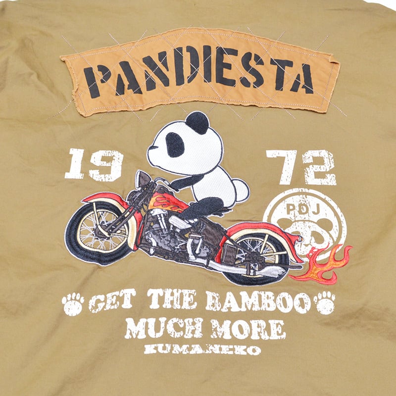 今回は伸縮性のあるストレッチ素材でミリタリーテイストなシャツでバイカーパンダを大きく刺繍で表現しました。
