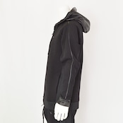 フードと袖にレザーを差し込んだ異素材ジップアップフーディー。