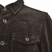 細いポリエステル糸をベースに両面パイルのモール糸を編みこんだラッセル編みのダイヤ柄ジャカード素材。