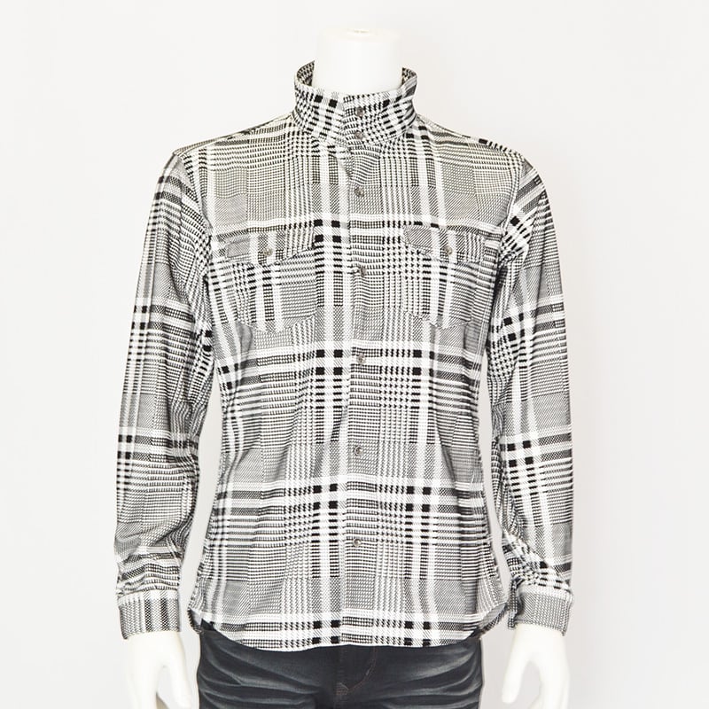 衿端まで止められるスタンドカラーが特徴的なダブルパッチデザインのシャツ。