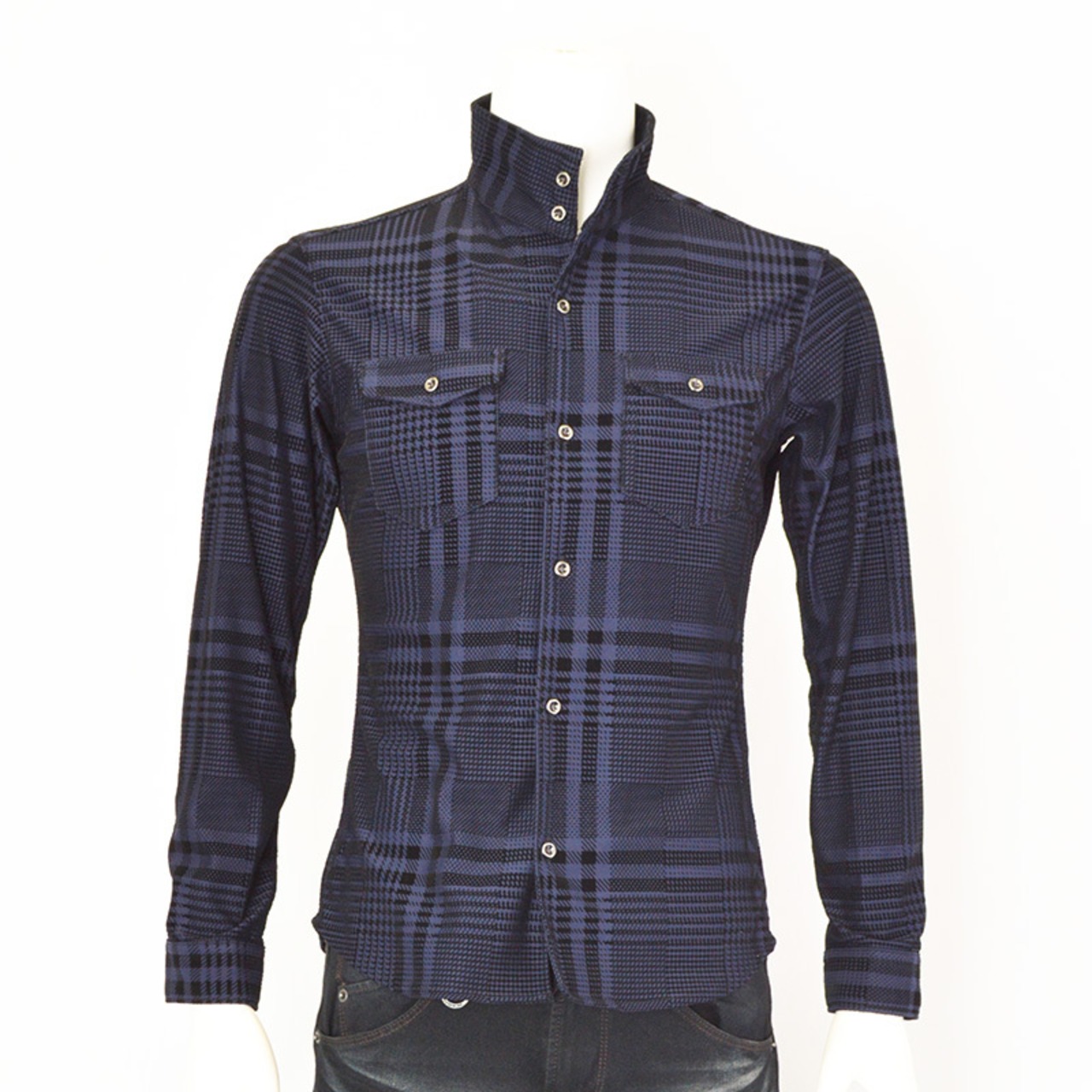 衿端まで止められるスタンドカラーが特徴的なダブルパッチデザインのシャツ。