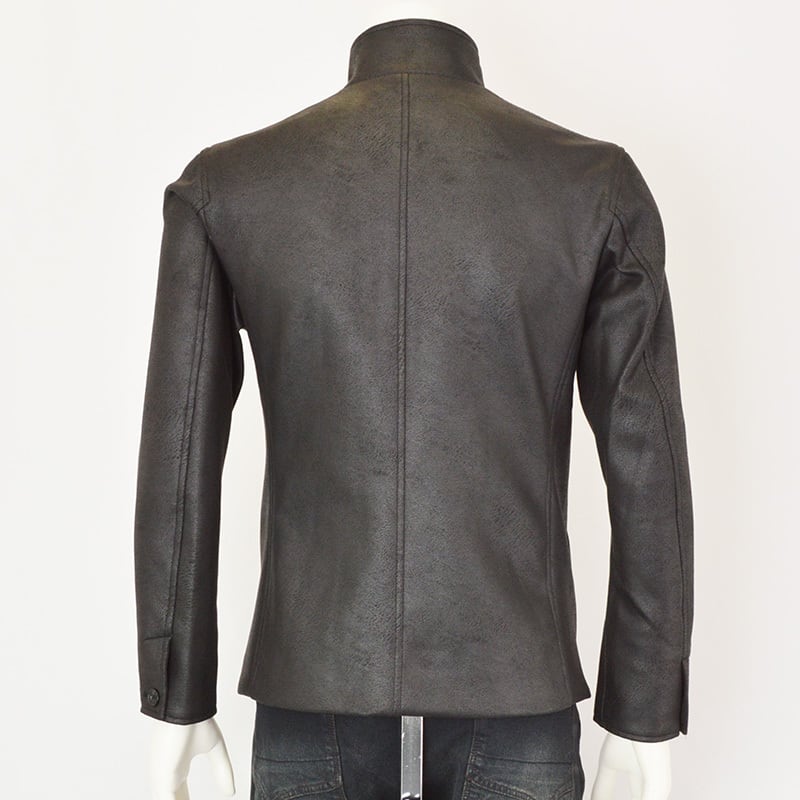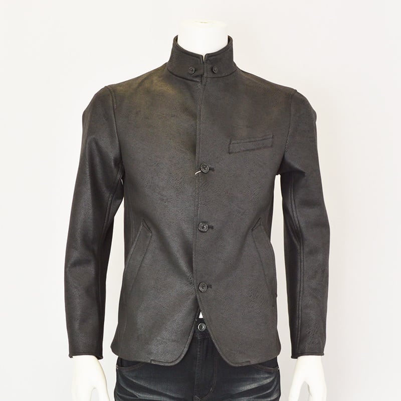 スタンド・イタリアンカラーのカヴァーオールデザインジャケット。衿端にはワイヤーを入れて遊べるようにし、その衿部分は折り返してラペルとしても綺麗に収まる設定です。衿タブで上まで止める事が出来るので防風性もあり、表地に追従する様にストレッチ裏地を採用した総裏仕様なので着心地も抜群です。左胸ポケットはフェイクチーフ仕様、袖口は本切羽、腰ポケットは斜めに作り、使いやすくしています。