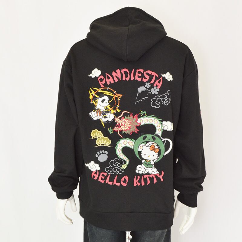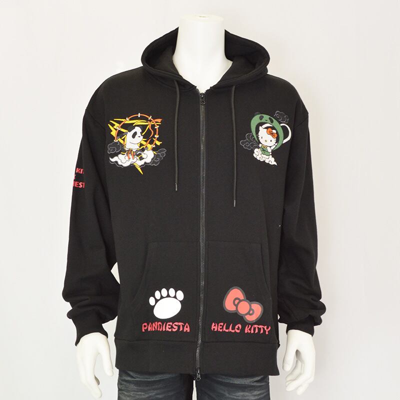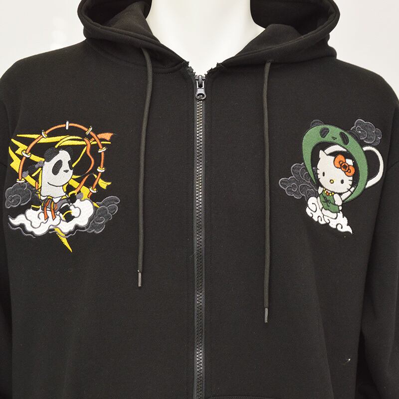 そして前面の胸元にもファスナーを挟んで雷神パンダと風神キティが対峙。カンガルーポケットにはパンディエスタのフットスタンプとキティちゃんのリボンがプリントされています。