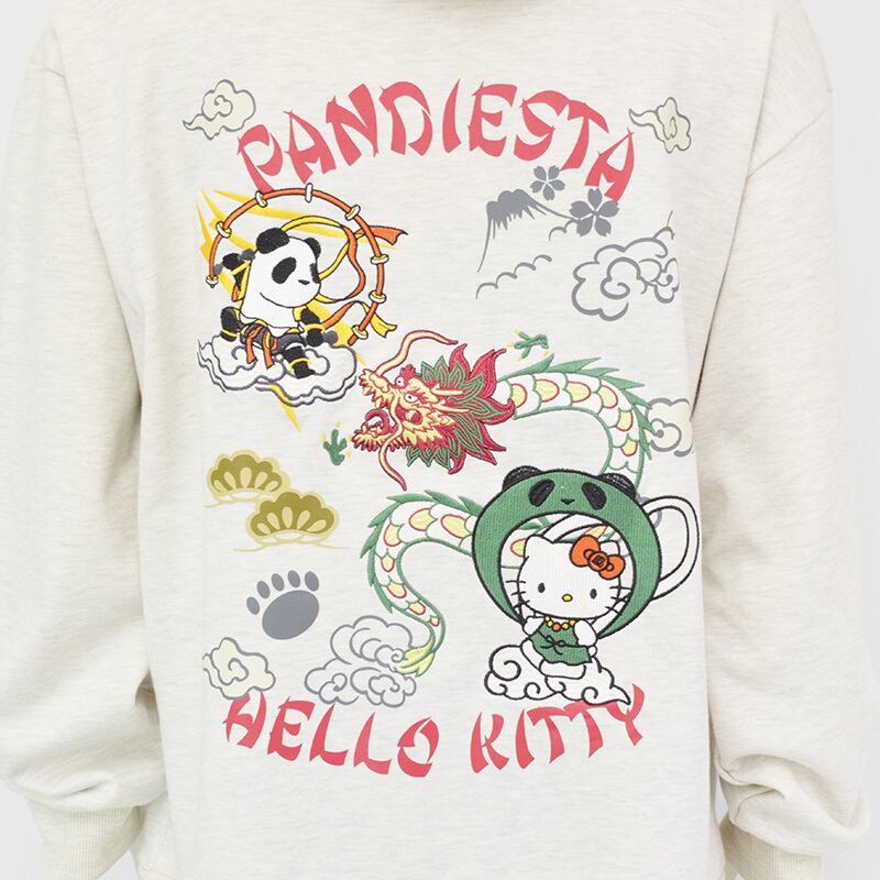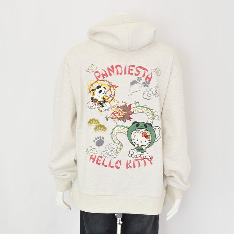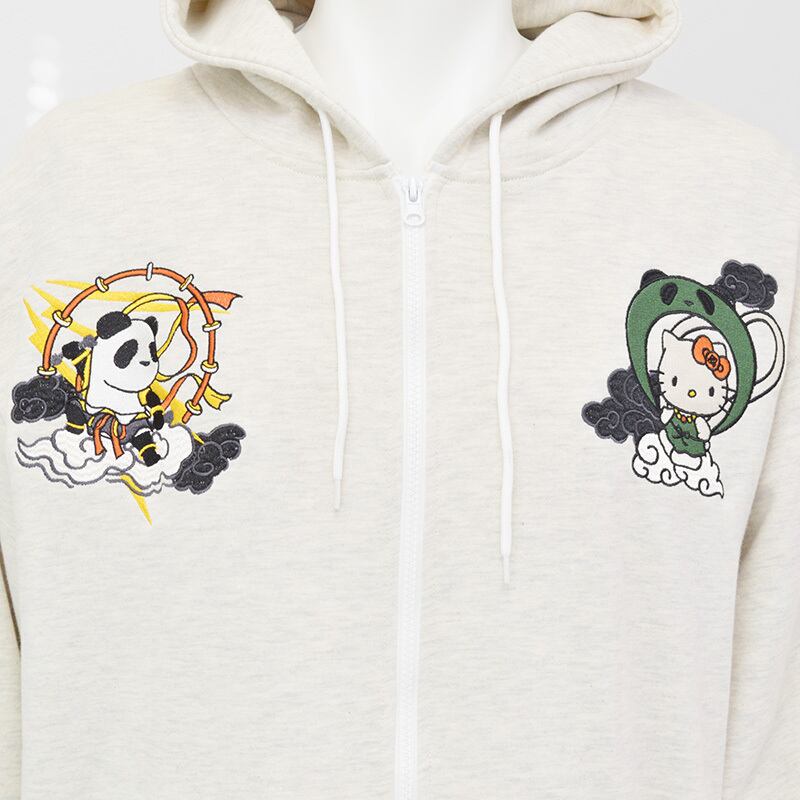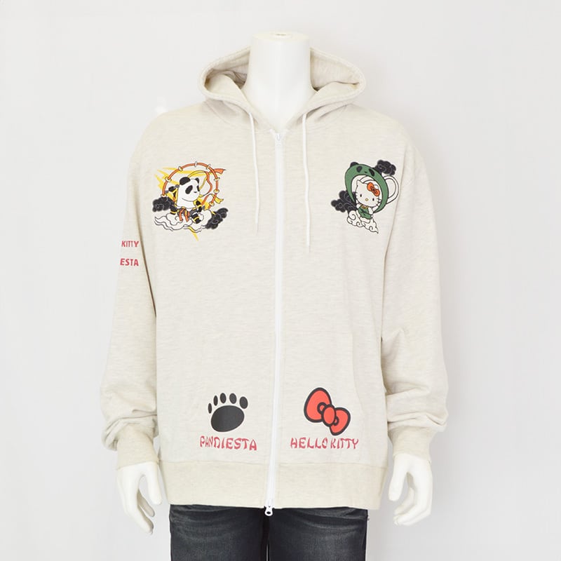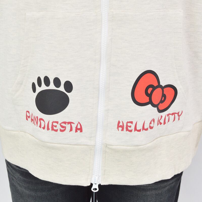 そして前面の胸元にもファスナーを挟んで雷神パンダと風神キティが対峙。カンガルーポケットにはパンディエスタのフットスタンプとキティちゃんのリボンがプリントされています。
