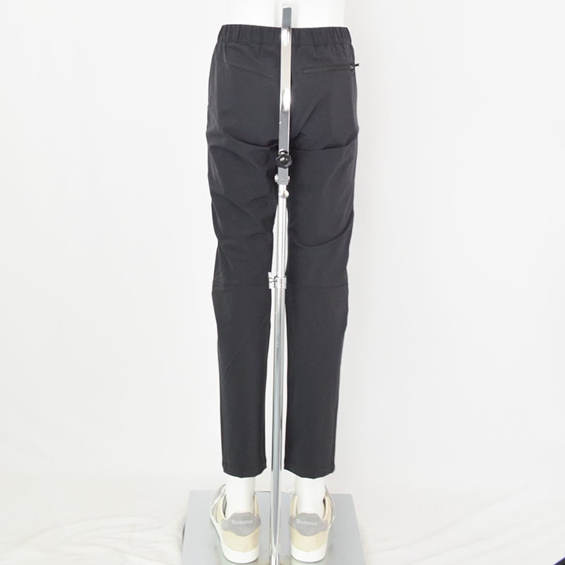 ポリウレタンとリサイクルナイロンを一部使用した混紡生地は、高いストレッチ性を持ち、ニットのような伸縮性と着心地のよさが特徴です。テーパードシルエットでありながら、立体的なパターンで脚上げがスムーズにできます。ハーネス使用を想定し、ウエストにバックルを設けないすっきりした腰周り。フロントのファスナーはダブルスライダー仕様です。