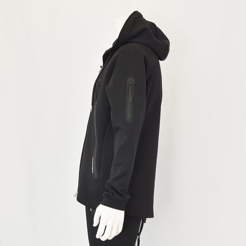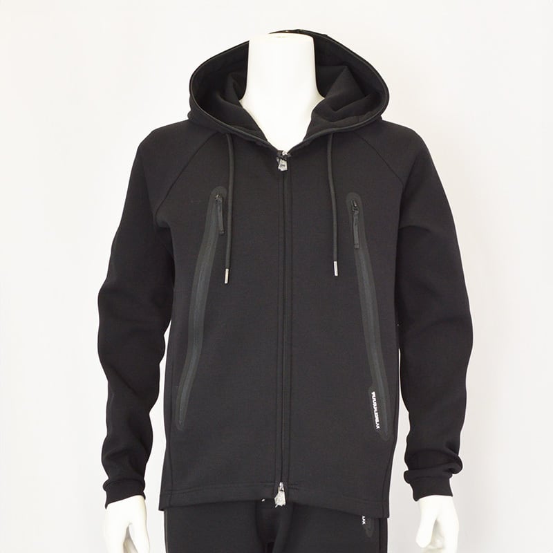 フロントに走る大胆なファスナーポケットがシャープな表情のジップアップパーカー。