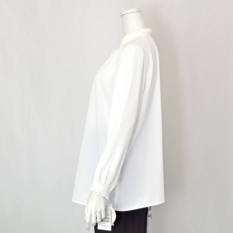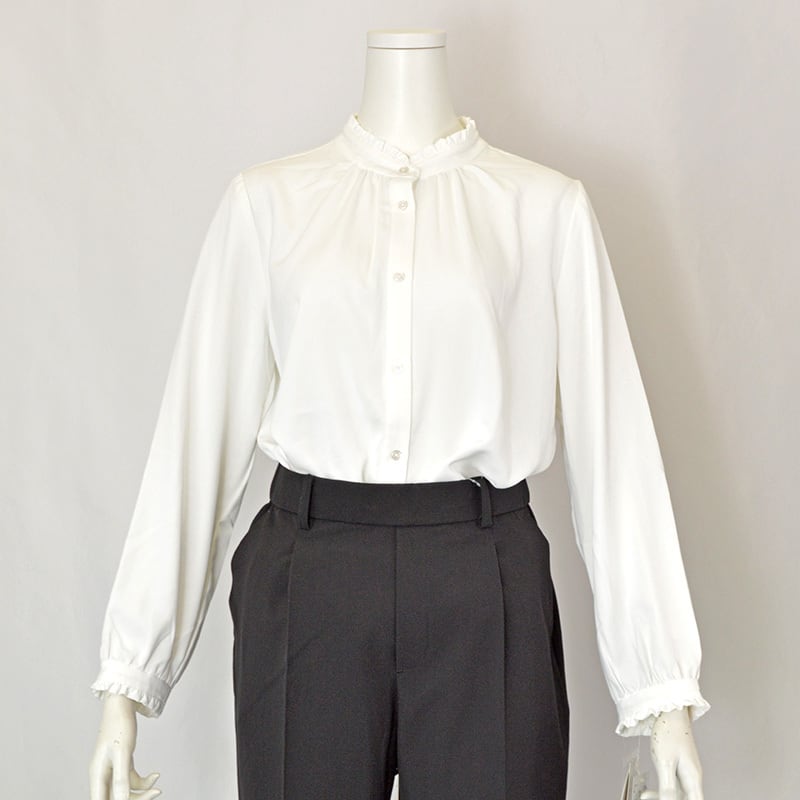 さりげないフリルをあしらったスタンドネックが、顔まわりを華やかに演出する上品ブラウス。