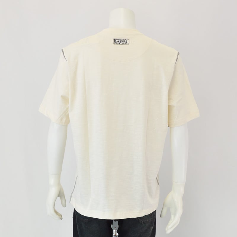 濃い色調のフロントグラフィックプリントが入った生成りカラーのニットTシャツ。リブ仕上げのクルーネックと、肩にコントラストの効いたステッチが見える半袖。