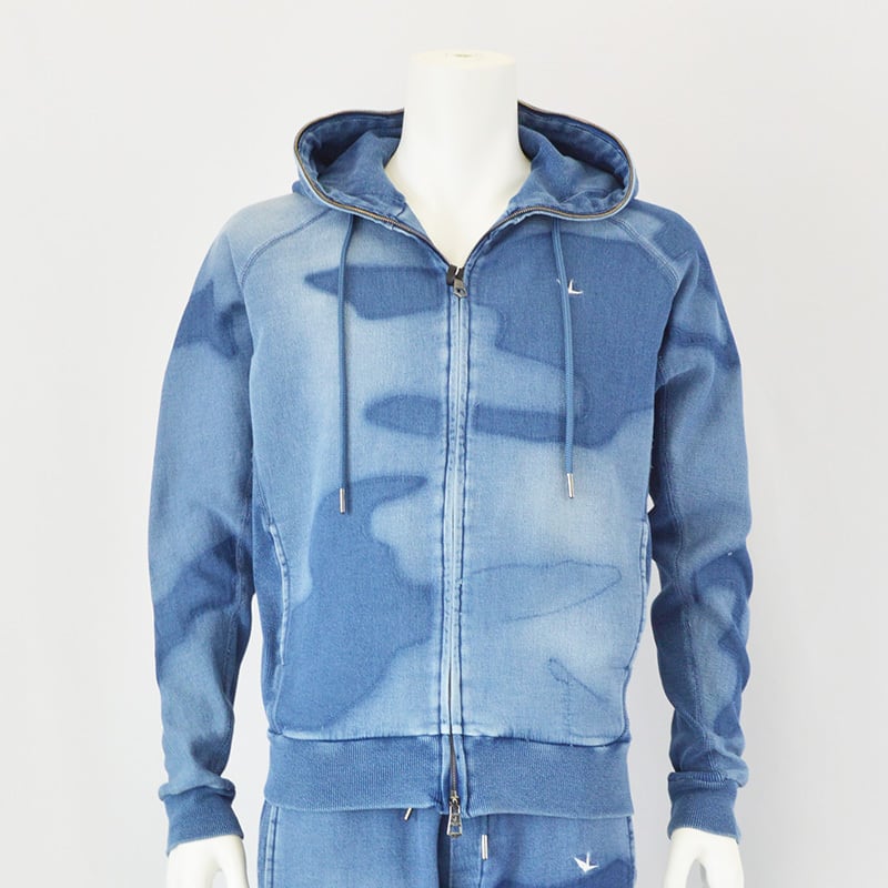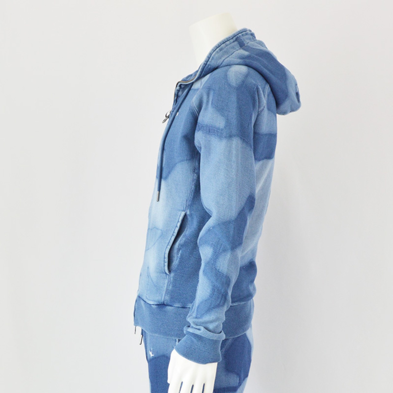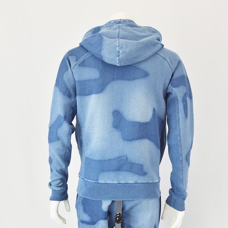ブランドアイコンとなるカモフラージュ柄にインディゴ染めのニュアンスを掛け合わせたジップアップフーディー。