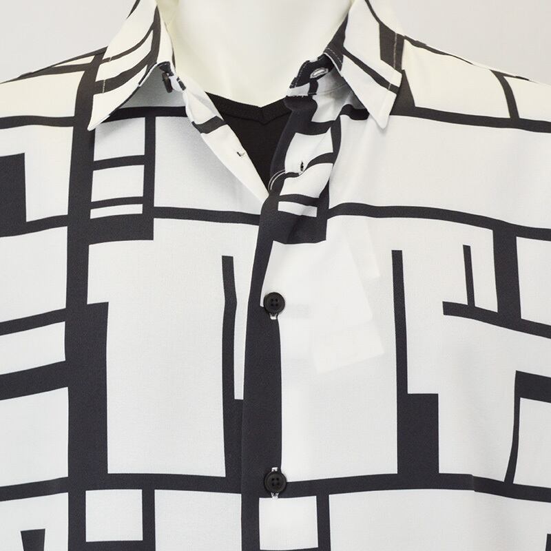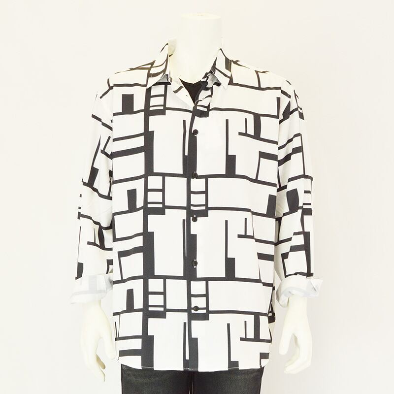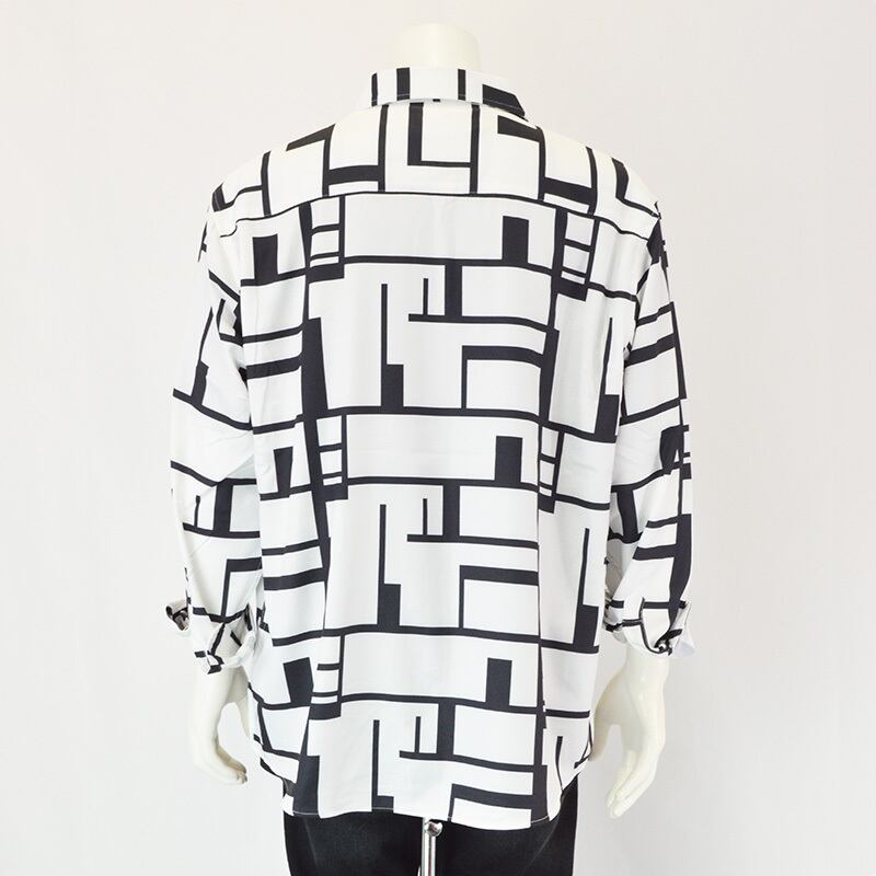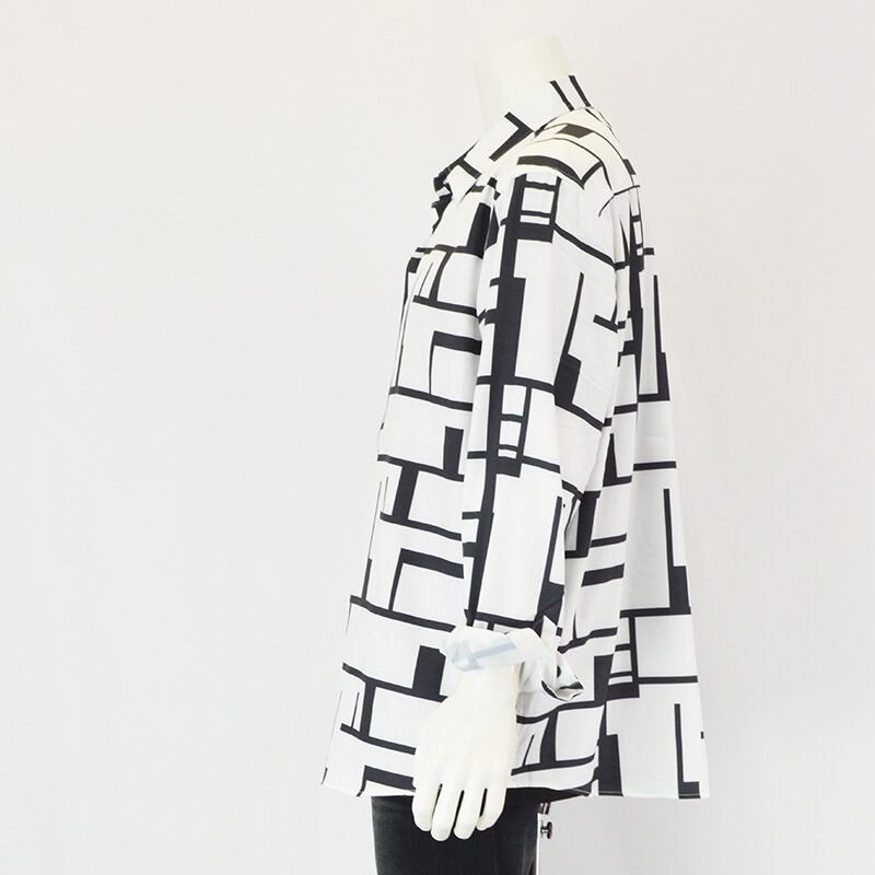 大胆なモノトーンの幾何学柄が目を引く、存在感抜群の一着。直線的なラインを組み合わせたアート調デザインが、シンプルながらも洗練された印象を与えます。ゆったりとしたシルエットでリラックス感があり、軽やかな着心地も魅力です。
