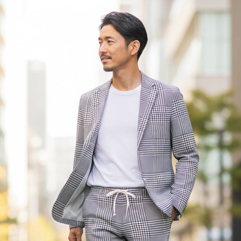同生地のスラックスと合わせれば大人の余裕を感じさせるトラッドなスタイルに。