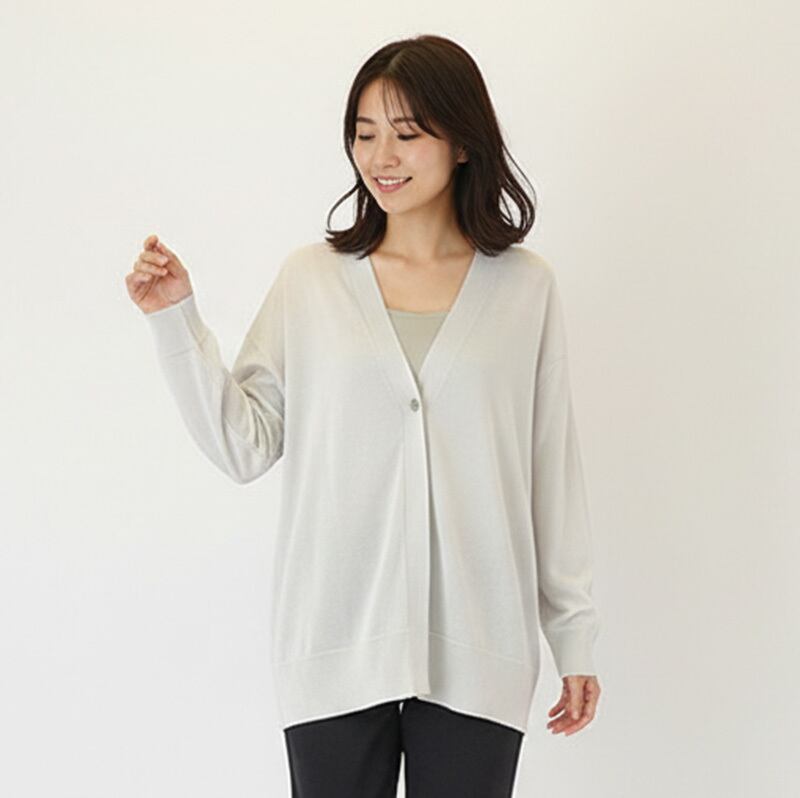 フロントに配された一つボタンがすっきりとした印象のカーディガン。