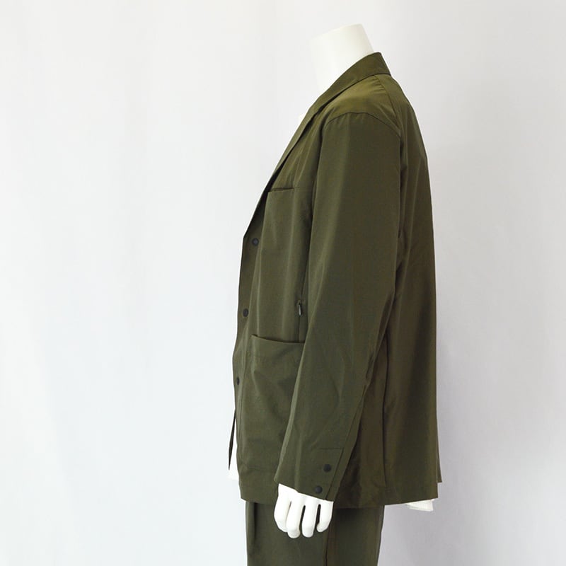 軽量でシワになりにくく、コンパクトに持ち運びが可能なため、出張や移動時にも便利。同素材のパンツとのセットアップスタイルもおすすめです。