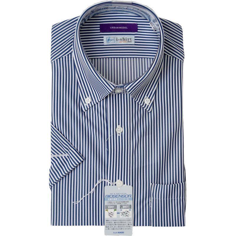 完全ノーアイロン|ワイシャツ|アイシャツ|i-Shirt|半袖|スリムフィット|ネイビー|ボタンダウン|ストライプ