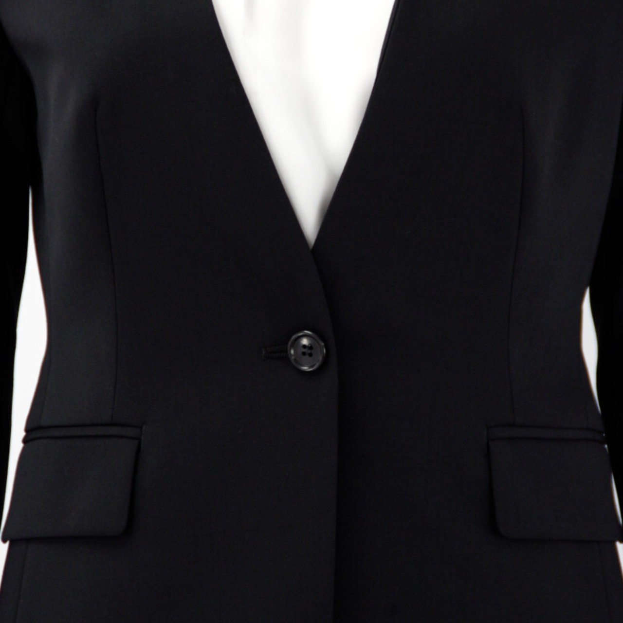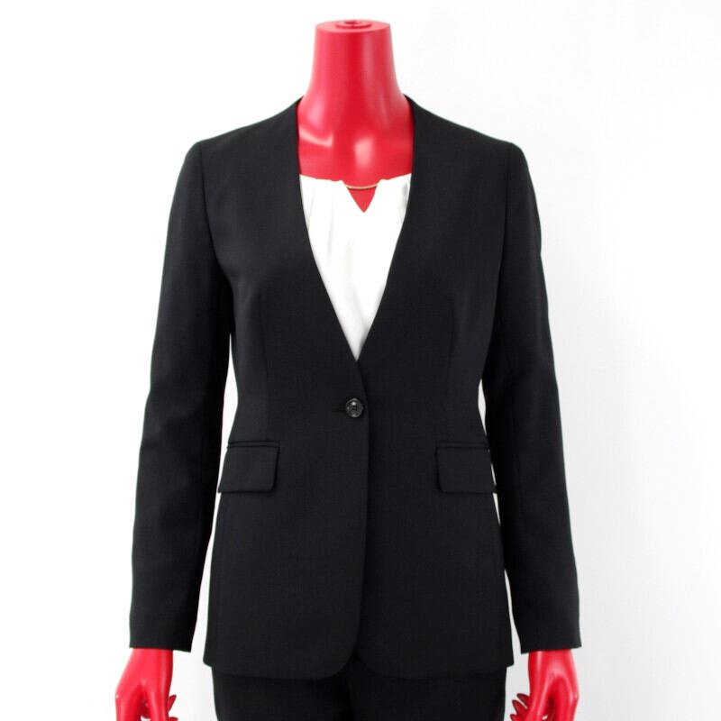 フロントがすっきりとした見え方のシングルVカラーレスジャケット。