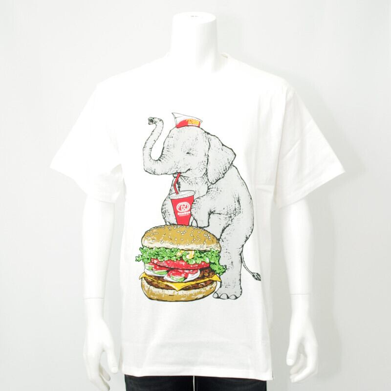ドムドムの店員さんに扮したゾウが「ビッグドム トマト&チーズ」を持って現れました。ボディはUSA COTTONを編み立てたオリジナル生地を使用。ほどよい張り感と油分が少なくカラっとした肌触り、硬めの質感が特徴。着ていくうちに少しずつ柔らかくなり、肌に馴染みの良いデイリーウェアに最適なTシャツ。