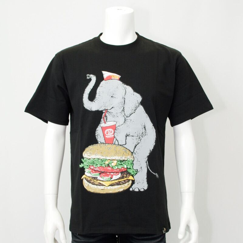 ドムドムの店員さんに扮したゾウが「ビッグドム トマト&チーズ」を持って現れました。ボディはUSA COTTONを編み立てたオリジナル生地を使用。ほどよい張り感と油分が少なくカラっとした肌触り、硬めの質感が特徴。着ていくうちに少しずつ柔らかくなり、肌に馴染みの良いデイリーウェアに最適なTシャツ。